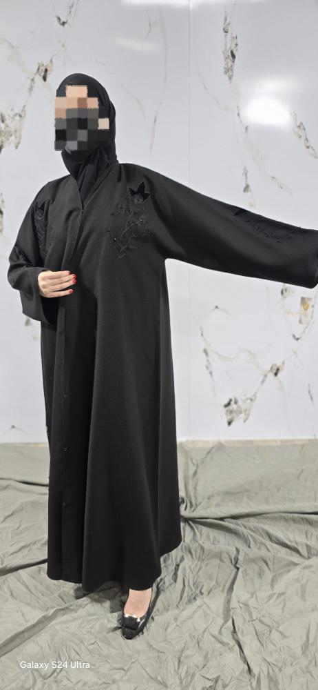 نص كلوش نوع كوري قماش كريب اضافة شغل هااري تطريز من الامام والكم بلون أسود لاتحتاج الى كوي بعد الغسيل